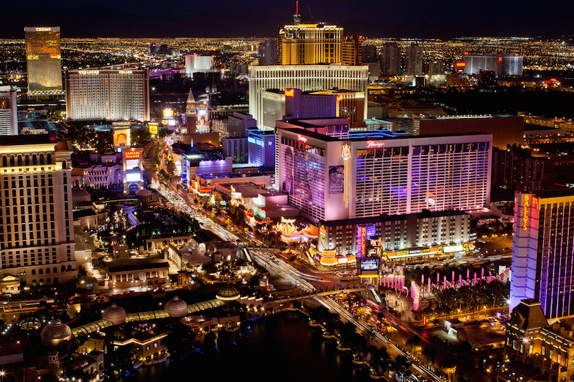 The gambling mecca of the world, Las Vegas is situated in the midst of the southern Nevada desert landscape. Casinos can be found throughout Las Vegas, but the strip, a stretch of Las Vegas Boulevard South, contains the most of them. It features giant mega-casino hotels, decorated with lavish care and attention to detail to create a fantasy-like atmosphere. The casinos often have names and themes that evoke romance, mystery, and far-away destination.